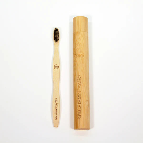 Worthy Picks bamboo toothbrush travel case is made from natural polished bamboo! This bamboo travel case is so beautiful and super light weight! Perfect to pack your bamboo toothbrush and eliminate more plastic from your life.